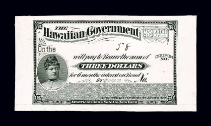 1449 ES image$3.00 Government bond coupon essay, on 76x40mm card printed by the American Bank Note. Co., also similar $30.00 Government bond coupon overprinted "Specimen" and with punch hole (light creasing), plus 1918 sheet of 30 $3.00 bond coupons for the Kona & Kau Railway Co., slight creasing and band of toning at the very top affecting three coupons, otherwise fine-very fine and an interesting lot of scarce items. (Image) Est. 400-500