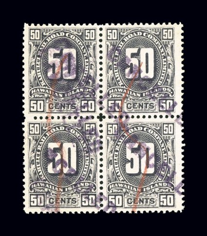 1452 Obl M-H #155 imageM-H #155, 50c Kahului Railroad, an especially well-centered used block of four, purple "Cancelled" handstamps and usual red crayon cancels, strong color, balanced even margins, choice very fine; a seldom seen used high value multiple; ex-Honolulu Advertiser. (Image) Est. 300-400