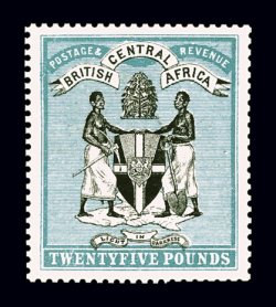 1459 og 31 image#31, 1895 £25 Blue and black Coat of Arms, extraordinarily well centered, deep vivid color and a sharp impression on fresh white paper, o.g., h.r., diagonal crease which the current certificate states is "an attempt to repair a horizontal crack", extremely fine appearance; 1969 and 2005 BPA certificates (S.G. #31; £7,500). (Image) $6,500.00
