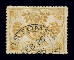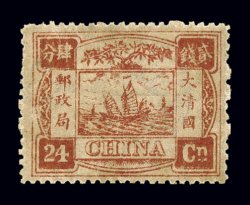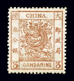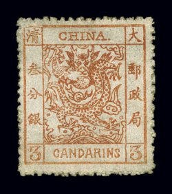 1565 og 8 var. image#8 var., 1883 3ca Pale red, thick paper with rough perforations, broken top left corner, cliche 6, this is also the cliche that shows the plate flaw at left mouth of dragon, which at this stage is quite dramatic, quite well centered, scarcer pale red shade, slightly disturbed o.g., very fine (Chan #11ab). (Image) Chan $850.00+