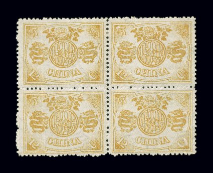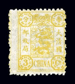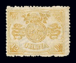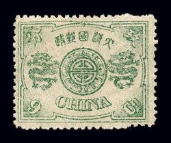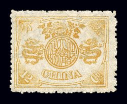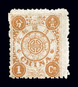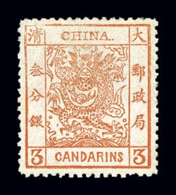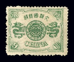 1569 ngog 1/9 #1/9, 1878-83 1ca-5ca Large Dragons, nice selection of twenty mint or unused examples of these first issues, most are the 1878 thin paper printings with an excellent range of shades, especially of the 1ca and 5ca with five of the former and four of the latter, 1ca with wide margins is the only value representing that issue, plus all three values on thick paper with clean cut perforations and a 1ca and 3ca with rough perforations, all are quite attractive, flaws where present are quite minor, gum ranges from several without gum to some with full o.g., overall a fine-very fine assemblage (Chan #1/11; $10,185.00). $6,050.00