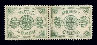1576 og 22i image#22i, 1984 9c Dowager, first printing, horizontal tete-beche pair, highly select example of this popular variety, possessing spectacular centering for this normally poorly centered issue, incredibly fresh and crisp, rich deep green color, full o.g., lightly hinged, extremely fine and exceedingly choice; horizontal pairs are considerably scarcer than their vertical counterpart and especially desirable in this remarkable premium condition (Chan #28j; $1,200.00). (Image) $1,000.00