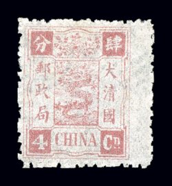 1598 O 31 var. image#31 var., 1897 4c Small numeral surcharge on 4ca Dowager, basic stamp with long stroke in character for four, exceptionally well centered used single with brown pa kua cancel at left so that the variety is clearly visible, very fine and remarkably scarce; unlisted in Scott (Chan #40b). (Image) Chan $700.00