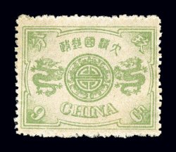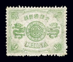 1584 og 22n image#22n, 1897 9ca Dowager, second printing, a particularly attractive appearing example of this key value of the rare second printing without surcharge, marvelously well centered, possessing bright yellow green color, full o.g., lightly hinged, faint vertical creasing at left and a trace of soiling, otherwise extremely fine appearance and a particularly rare stamp (Chan #28S; $2,800.00). (Image) $2,750.00