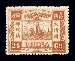 1586 ng 24n image#24n, 1897 24ca Dowager, second printing, unused, regummed, strong color that is often difficult to tell from the first printing under ordinary light, but easily differentiated under ultraviolet light, attractive fine centering and an exceptionally scarce value (Chan #30S; $1,600.00). (Image) $1,300.00