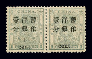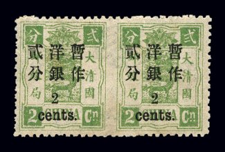 1597 og 30e var. image#30e var., 1897 2c Small numeral surcharge on 2ca Dowager, horizontal pair imperforate between, a magnificent example of this extremely rare variety, being far scarcer than its modest catalog value implies, in addition the left stamp shows the "2" over "en" of "cent" variety (Chan #39b), beautifully centered within large margins, its color is rich and characteristic of the first Dowager printing, full o.g., very lightly hinged, extremely fine; only a handful of this rare perforation error are known to exist and in combination with the spacing variety it is quite likely unique; catalog values are for a normal pair imperforate between; signed F. Z. Chun (Chan #39f, $2,200.00+). (Image) $2,000.00+