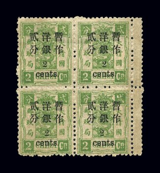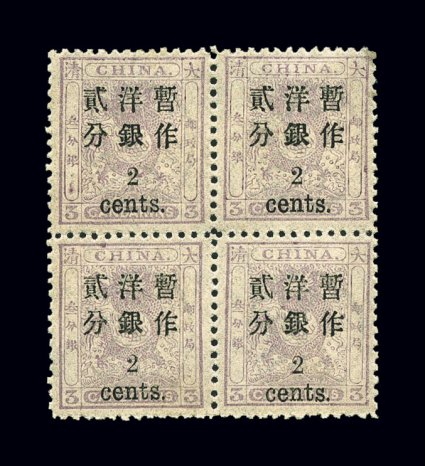 1589 og/nhbl 25-27 var. image#25-27 var, 1897 1c-5c Small numeral surcharges on 1ca-5ca Small Dragons cplt. in fresh mint blocks of four, attractive colors, very well centered especially for blocks, 1c value shows broken "Yin" character in bottom left stamp, and the top right stamp of the 5c block has a rounded top right corner frame variety, o.g., bottom pair of each block is never hinged, very fine-extremely fine; catalog values are for four hinged singles (Chan #31-33, 31f, 33c; $1,010.00+). (Image) $760.00+