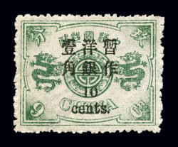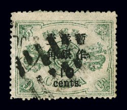 1588 ogO 25-27, 25a, 25 var. image#25-27, 25a, 25 var., 1897 1c-5c Small numeral surcharges on 1ca-5ca Small Dragons, a specialized selection of a complete set plus five additional mint 1c on 1ca Green and one used showing varieties, most of which are not listed in Scott, includes a pair, one stamp with 4mm spacing se-tenant with normal, scarce small size design of the basic stamp and other varieties of overprint and basic design, o.g., few h.r., very fine (Chan #31-33, 31a, d,e,f; $840.00). (Image) $350.00+