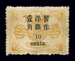 1599 og 38 image#38, 1897 1/2c Large numeral surcharge with wide spacing on 3ca Dowager first printing, exceptionally scarce mint example, attractive orange yellow color characteristic of the first printing, full o.g., lightly hinged, centered to the right but nearly very fine for this and actually a rare stamp in original gum mint condition (Chan #47; $1,800.00). (Image) $2,000.00