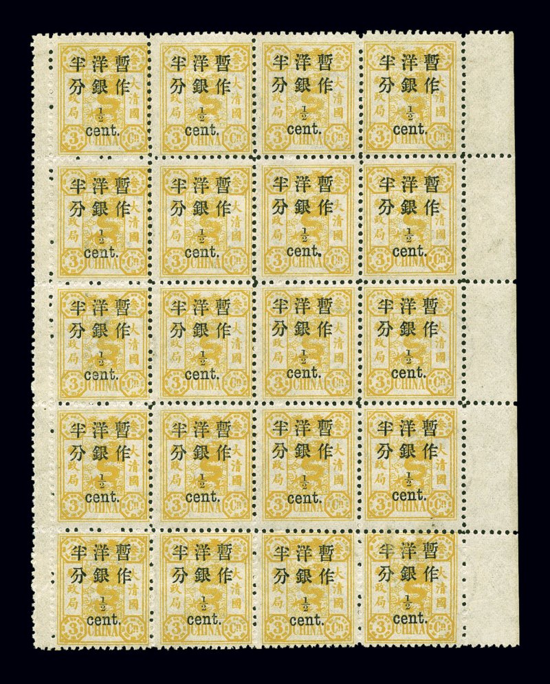 1594 og/nhbl 28, 28 var. image#28, 28 var., 1897 1/2c Small numeral surcharge on 3ca Dowager, full mint pane of 20(4x5) with gutter selvage on the sides, position 8 shows the variety of "1" in "1/2" shifted to the right, the pane is extremely fresh with brilliant color, full o.g., only lightly hinged in two stamps, the rest are never hinged, very fine-extremely fine; Scott catalog value is for normal hinged singles (Chan #37, 37fi; $240.00+ for hinged singles). (imagea) (Image) $190.00+
