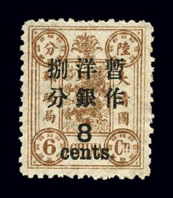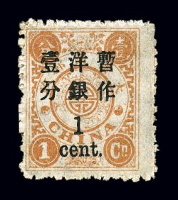 1616 og 64 image#64, 1897 30c Large numeral surcharge with narrow spacing on 24ca Dowager first printing, a magnificent mint example of one of the great rarities of both the Dowager issues as well as all of China, possessing exceptional physical features that make this an especially pretty stamp including being marvelously well centered within large margins, complemented by full even perforations, the color is bright and distinctive of the first printing Dowager issue, plus it has full original gum being lightly hinged with just a bare hint of aging, extremely fine.The first printing Dowager commemoratives were the only ones to be regularly issued as unoverprinted stamps. When a currency change was made it was decided to overprint this issue with new values. Small numeral surcharges were issued exclusively on this issue. When these ran out it was decided to print new stamps exclusively for overprinting and at the same time recall all unoverprinted Dowager issues from the post offices for overprinting. As the printers went through the two different spacings of large numeral overprints, they overprinted the original first printings that were being recalled as they came in along with the new printings that were specially printed for overprinting. This whole process produced some very scarce stamps depending on how many stamps were returned for overprinting. This along with the many varieties of both stamps and overprints has made a fascinating collecting area for the students of China.The stamp offered here is the epitome of the rarities produced by the above process. It is believed that only one sheet of the 24ca First Printing Dowager was given this late large numeral surcharge with 1 1/2mm spacing. In referring to the 30c on 24ca narrow large numeral surcharge Dr. Ma said that this stamp and the one on the new printing "...are two of the rarest and most valuable 'classic' Chinese stamps - scarcer than the 'small dollar'." We are pleased to offer this amazing rarity that is worthy of the finest collections of Chinese stamps (Chan #70; $45,000.00). (Image) $27,500.00