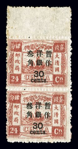 1612 og 55, 55 var image#55 var., 1897 30c Large numeral surcharge with wide spacing on 24ca Dowager, second printing, variety of character for "Three" of surcharge (Chan T47B), attractive top gutter margin vertical pair, the variety is in the bottom stamp being a different variety of the same character as the previous lot, brilliant color on bright paper, o.g., slightly disturbed with a bit of offset, fine centering and a handsome multiple; unlisted in Scott (Chan #64, 64b). (Image) Chan $800.00