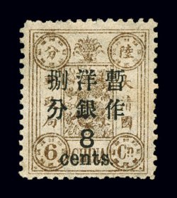1613 og 61 image#61, 1897 8c Large numeral surcharge with narrow spacing on 6ca Dowager first printing, well centered mint single, rich brown color, o.g., h.r., very fine and choice; the narrow spacing is only found on the first printing of this value, apparently a later printing was not needed making for a very scarce value (Chan #70; $1,200.00). (Image) $900.00