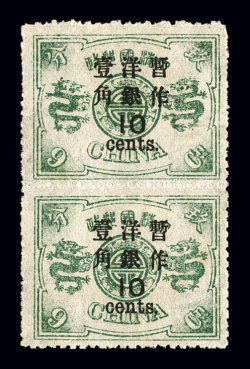 1614 og/nh 62 image#62, 1897 10c Large numeral surcharge with narrow spacing on 9ca Dowager first printing, lovely mint vertical pair, unusually fresh with attractive deep color, especially well centered, full clean o.g., bottom stamp barely hinged and top stamp is never hinged, very fine-extremely fine (Chan #71; $440.00+). (Image) $400.00+