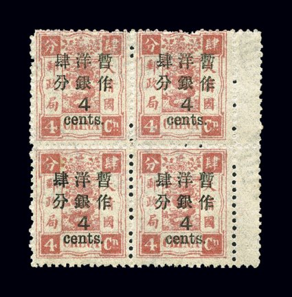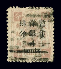 1620 O 68 var. image#68 var., 1897 4c Large numeral surcharge with narrow spacing on 4ca Dowager later second printing, incorrect character "four" of the surcharge used example with black pa kua cancel, quite well centered, couple short perfs. at top, otherwise very fine; this variety is a use of the wrong size and style of type in the top left Chinese character and quite rare on this printing; unlisted in Scott (Chan #77a). (Image) Chan $1,800.00