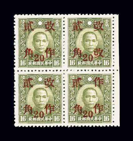 1682 nhbl 538(e20) var. image#538(e20) var., 1943 Kiangsi red 20c surcharge on 16c Olive grey, incorrect characters at right, right margin mint block of four, top right stamp has the lower right character "Gai" instead of "Tso", and bottom right stamp has the upper right character "Tso" instead of "Gai", block is exceptionally fresh and attractive, o.g., n.h., very fine; impressive display of these two rare varieties; not listed in Scott (Chan #713a, 713b) (Image) Chan for hinged $560.00