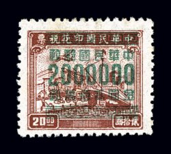 1681 ng 532(c20) image #532(c20), 1943 Hunan red 20c surcharge on 13c Green, unused, desirable single of this extremely rare 20c surcharge, bright colors and well struck surcharge, attractive fine centering which is very typical for this stamp; a key value of these challenging surcharges that is missing from most collections (Chan #690; $1,200.00) (Image) $1,000.00