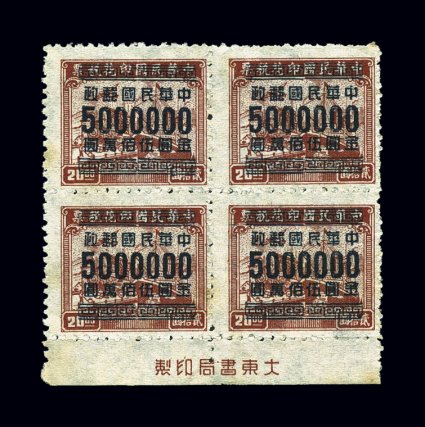 1686 ogbl 937-47 image#937-47, 1949 $50.00-5,000,000.00 Gold Yuan surcharges on $10.00-20.00 Revenues, Hankow printing cplt. in bottom imprint blocks of four, unused, without gum as issued, impressive set of this scarce issue, strong fresh colors, imprint selvage intact but has been folded under for mounting and a few values have traces of toning in the selvage, fine-very fine and exceptionally scarce in blocks of four; catalog values are for four sets of singles (Chan #G117-27; $9146.00) (Image) $7,405.00+