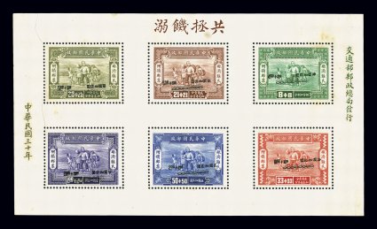1689 og B9a var. image#B9a var., 1944 War Refugees souvenir sheet, surcharge misplaced sloping up, this misalignment puts the surcharge close to its proper position at an angle on the left stamps, but virtually in the middle of the right stamps, o.g., n.h., gum toning (a frequent phenomenon on this sheet) and wrinkles in the left selvage, still very fine for this exceedingly rare variety; not listed in Scott (Chan #MS2c) (Image) Chan $25,000.00