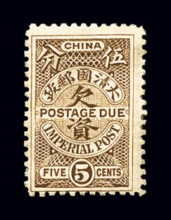 1691 ng Chan #DU1 imageChan #DU1, 1911 1/2c Brown postage due, unissued value, unused, without gum, beautifully centered, brilliant orange brown color, extremely fine and exceptionally rare; in 1911 a new order was made with Waterlow for six values of postage dues with the instruction to change the color from blue to brown, the 1c and 2c values in brown arrived first and were issued, the 1/2c, 4c, 5c and 20c did not arrive until after the Manchu government had been overthrown and the Republic instituted, these four values were immediately issued with Republic of China overprints, only a very few unoverprinted stamps found their way into collectors' hands making them exceedingly elusive and seldom offered; listed but not priced in Chan, not listed in Scott but mentioned in a footnote after #J16. (Image) Est. 400-500
