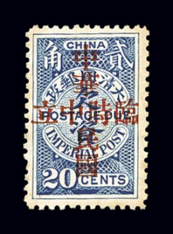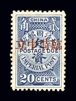 1693 og Chan #DU4 imageChan #DU4, 1911 20c Brown postage due, unissued value, mint single of this value that was never placed in use without the Republic of China overprints, quite well centered, attractive bright color, o.g. with h.r. and slight adherence, couple of trivial gum soaked perfs. at right, otherwise very fine for this rare stamp; listed but not priced in Chan, not listed in Scott but mentioned in a footnote after #J16. (Image) Est. 400-500