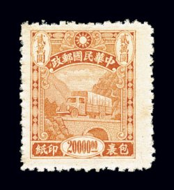 1690 og C42 image#C42, 1946 $73.00 on 25c Orange Air Post, unwatermarked, perforated 14, magnificent mint example of the key air post issue of China, possessing virtually perfect centering within incredibly large lavish margins, brilliant orange color, full o.g. with just a trace of hinging, extremely fine gem; we doubt that a nicer example of this rare stamp could be found (Chan #A47; $1,600.00). (Image) $1,300.00
