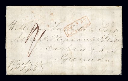 1703 c image1840 Inbound folded letter to Carriacou, prices current paid from Liverpool by packet with written message, red boxed "Paid at/Liverpool" and matching double-arc c.d.s. of that city on the reverse, rated 1/- in ms., very fine; Carriacou is a small Island between Grenada and St. Vincent being the major Island of the Grenadines, its post office was not issued its own handstamp until 1841; mail to or from this remote West Indian island is rare from this early period. (Image) Est. 200-300