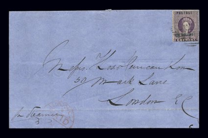 1707 c 11 image#11, 1875 "Postage/One Shilling" surcharge on purple, single with bright color, centered to the right, tied to 1879 cover to London by portions of two indistinct strikes of the "A15" in bars oval cancel, Grenada small c.d.s. with index letter "A" on reverse, red London backstamp, fine example of a scarce stamp on cover (S.G. #13) (Image) Est. 300-400