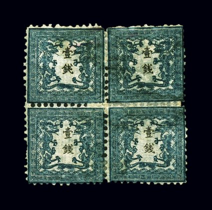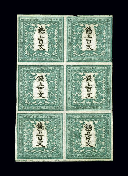 1713 ogbl 4 image#4, 1871 500m Blue green and black, on laid paper, plate I, unused, without gum as issued, a magnificent and rare block of six (2x3), positions 22-23/38-39, clear to large margins virtually all around just touching the frame lines of the top right stamp at a couple of points, bright blue green color on fresh paper, very fine-extremely fine; an incredibly handsome First Issue multiple of the key high value and seldom found any more in such a large multiple (JSCA #4; Y720,000 for block of four and two singles). (Image) for singles $2,400.00+