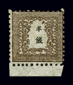1714 ng 5g image#5, 1872 1/2s Brown and black, on wove paper, plate I, position 38, bottom sheet-margin single, unused, gum perhaps sensibly removed as it often damages this fragile native paper, unusually full and quite even perforations, which are seldom found, and quite well centered for this narrowly set and scarcer plate, very fine;1995 ISJP certificate (JSCA #5b, Y40,000). (Image) $150.00