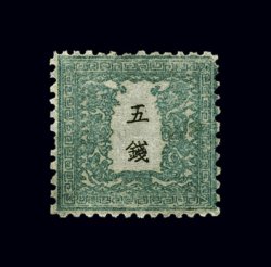 1717 ng 8 image#8, 1872 5s Blue green, on laid paper, plate II, unused with a trace of o.g., improved perfs. at bottom and left with some added perf. tips, very fine appearance and difficult stamp (JSCA #8; Y120,000). (Image) $500.00