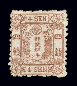 1729 og 35 image#35, 1874 4s Rose, syllabic 1, on foreign wove paper, a rare mint single of this value, strong deep color and sharp impression, o.g. with slight black adherence and small faint corner crease at bottom left mentioned for accuracy, still a very fine example of terribly difficult mint value; clear 2002 ISJP certificate (JSCA #31; Y520,000). (Image) $1,900.00