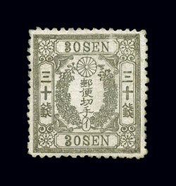 1725 nh 31 image#31, 1874 30s Gray, syllabic 1, on native wove paper, a pristine mint single possessing full crackly original gum that has never been hinged, remarkably fresh with strong dark gray color and prooflike impression, quite well centered, very fine; Japanese stamps from this very early period are seldom found in "post office" fresh condition, especially this rare high value, and are much scarcer than the modest premium given for never hinged by the specialized catalogs (JSCA #25; Y600,000). (Image) for hinged $2,400.00