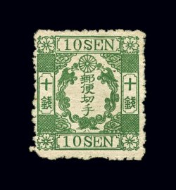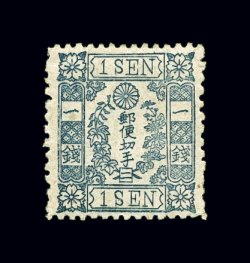 1724 og 31 image#31, 1874 30s Gray, syllabic 1, on native wove paper, a magnificent mint example of this rare high value, possessing numerous desirable features that are seldom found together on these early Cherry Blossom issues, including being beautifully centered within wide even margins, surrounded by full even perforations which rarely occurs on this fibrous native paper, fresh with bright color and detailed impression on clean white paper, full o.g., very lightly hinged; extremely fine; an exceptionally rare stamp and particularly so in this choice gem condition; signed Tyler and accompanied by a 2002 ISJP certificate (JSCA #25; Y500,000). (Image) $2,400.00