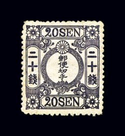 1732 og 38 image#38, 1874 20s Violet, syllabic 4, on foreign wove paper, attractive mint single in the lighter pastel shade, clean sharp impression, very well centered with nice full perforations, full o.g., light h.r., very fine and exceedingly choice; signed Tyler and accompanied by a 2002 ISJP certificate (JSCA #34; Y60,000). (Image) $200.00