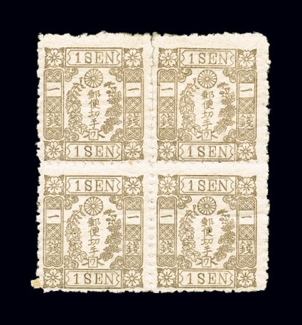 1735 og/nhbl 40, 41 image#40, 41, 1875 1/2s Gray, syllabic 4 and 1s Brown syllabic 13, on foreign wove paper, each in a mint block of four, the 1/2s with bottom sheet margin, full o.g., two stamps in each block never hinged, few separated perfs in 1s block, fine-very fine and uncommon in blocks (JSCA #41, 42; for hinged blocks Y65,000). (Image) for singles $260.00+