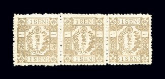 1736 og 41 image#41, 1875 1s Brown, syllabic 16, on foreign wove paper, lovely mint horizontal strip of three, wonderfully well centered within large margins, bright color on fresh paper, full o.g., light hinge reinforcement to the vertical perfs, extremely fine and attractive; signed Tyler and accompanied by a 2002 ISJP certificate (JSCA #42; for singles Y24,000+). (Image) for singles $90.00+