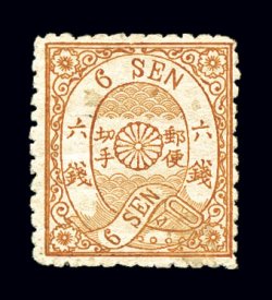1738 og 43 image#43, 1875 6s Orange, syllabic 13, on foreign wove paper, intense brilliant color and strong impression, attractive centering, full crackly o.g., h.r., very fine for this; 1995 ISJP certificate (JSCA #44; Y30,000). (Image) $125.00