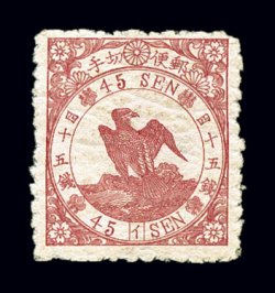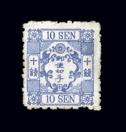 1741 ng 45 image#45, 1875 10s Ultramarine, syllabic 5, on foreign wove paper, a splendid unused example of this major rarity, fresh bright color on clean white paper, well centered, very fine; very few of this syllabic, which is believed to have been produced from just one plate, were printed; rarely offered either mint or unused, especially in this fresh attractive condition; 1997 ISJP certificate (JSCA #46; Y830,000). (Image) $3,250.00