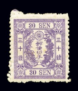 1744 og 49 image#49, 1875 30c Violet, syllabic 4, on foreign wove paper, exceptionally fresh color in a pretty pastel shade on bright white paper, quite well centered with full even perforations all around, disturbed part o.g., very fine and attractive (JSCA #48; Y35,000). (Image) $100.00
