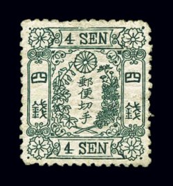 1746 og 52 image#52, 1875 4s Green, Ty. I, on foreign wove paper, exceptionally well centered mint single of this later value without syllabic, intense deep green color and sharp impression, full crackly o.g., lightly hinged, extremely fine; 2002 ISJP certificate (JSCA #40; Y50,000). (Image) $260.00