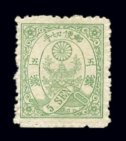 1747 og 54A image#54A, 1876 5s Green, on soft foreign wove paper, wonderfully choice mint single, being well centered with large margins, bright yellow green color on fresh paper, full o.g., very lightly hinged, extremely fine (JSCA #51; Y35,000). (Image) $190.00