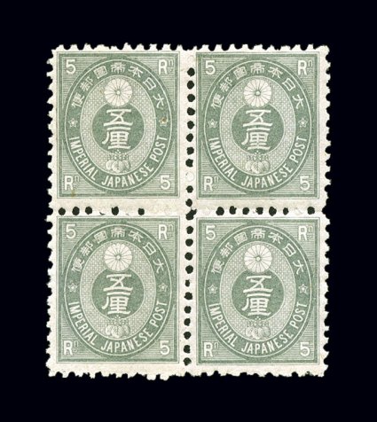 1748 nhbl 55 image#55, 1876 5r Gray, perforated 10, wonderful "post office" fresh mint block of four, lovely grey color and detailed impression on bright paper, full o.g., never hinged, very fine and choice example of this early Koban issue; scarce in never hinged blocks; Scott value is for four hinged singles; 2002 ISJP certificate (JSCA #61; Y40,000 for hinged block of four). (Image) $64.00+