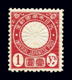 1752 nh 84 image#84, 1888 1Y Carmine, perforated 12, lovely bottom right corner-margin single, beautifully fresh with radiant color on bright paper, full o.g., never hinged, very fine and exceedingly choice with great eye appeal (JSCA #90; Y40,000). (Image) for hinged $160.00