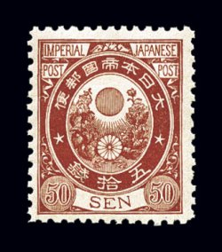 1751 nh 83 image#83, 1888 50s Brown, perforated 12, incredibly fresh mint single, gorgeous red brown color, crisp impression on brilliant white paper, o.g., n.h., extremely fine (JSCA #89; Y30,000). (Image) for hinged $100.00