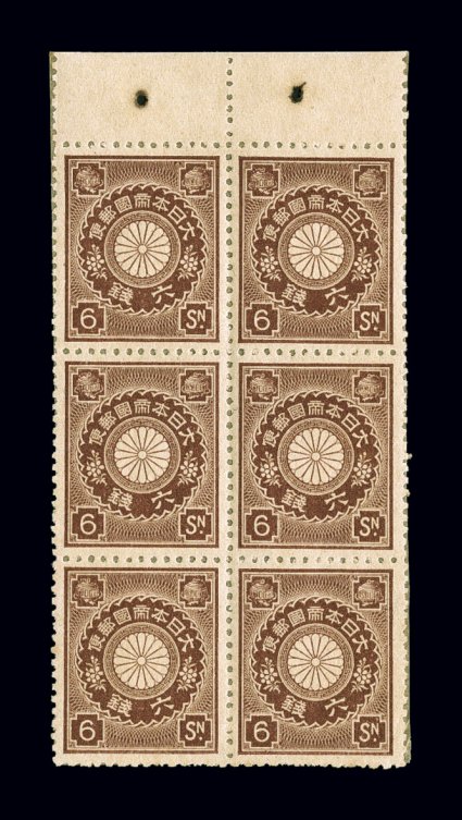 1757 nhBP JSCA #BP5 imageJSCA #BP5, 1907 6s Deep claret, handmade booklet pane of six, with interleaving attached in selvage as usual, extraordinarily well centered, intense deep color, crisp with full perforations all around, slight stain around the staple holes as usual, extremely fine and a very scarce booklet pane in this choice never hinged condition; catalog value is for hinged pane (Scott #101 var.). (Image) JSCA 100,000Y