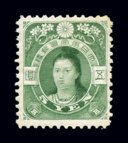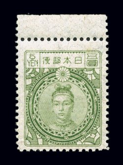 1764 og 113 image#113, 1908 5Y Green, unwatermarked, lovely mint single of this key high value, possessing rich deep green color on fresh bright paper, surrounded by full even perforations, clean o.g., very lightly hinged, choice very fine (JSCA #119; Y200,000). (Image) $725.00