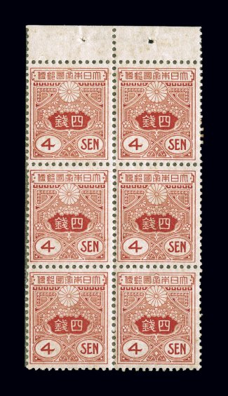 1765 nhBP JSCA #BP10 imageJSCA #BP10, 1913 4s Scarlet vermilion, unwatermarked, handmade booklet pane of six, with interleaving attached in selvage as usual, marvelously fresh example of this scarce pane, wonderfully well centered, brilliant color on bright paper, clean o.g., n.h., extremely fine; catalog value is for hinged pane (Scott #120 var.) (Image) JSCA 120,000Y