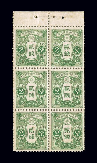 1766 nhBP JSCA #BP8 imageJSCA #BP8, 1913 2s Green, unwatermarked, handmade booklet pane of six, with interleaving attached in selvage as usual, quite well centered, fresh with bright color, o.g., n.h., rounded corner perf. in the bottom right stamp, otherwise very fine and very rare booklet pane; catalog value is for hinged pane (Scott #118 var.). (Image) JSCA 350,000Y