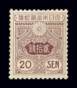 1767 nh 123 image#123, 1913 20s Claret, unwatermarked, pristine mint single, fresh with bright color, flawless o.g., n.h., very fine and choice (JSCA #139; Y46,000). (Image) for hinged $95.00